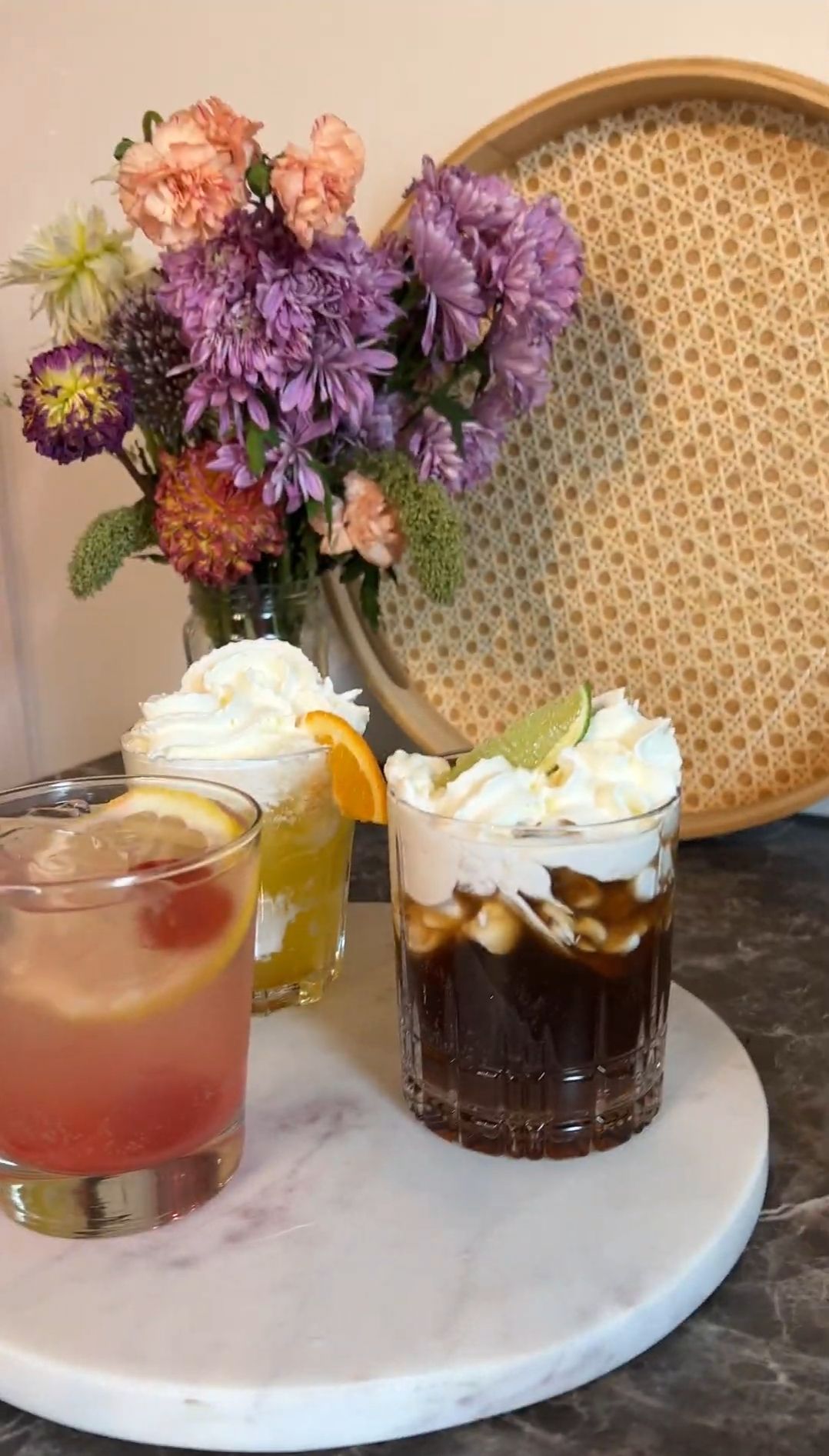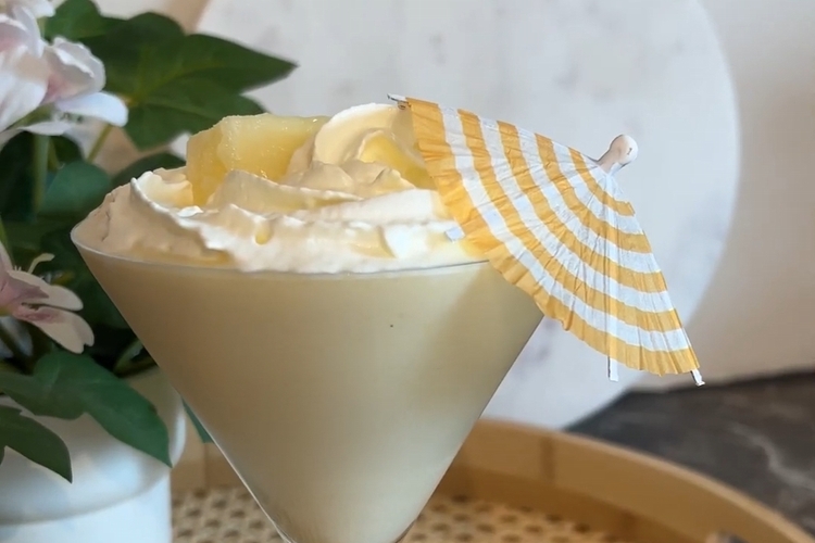 Ha blandingen over i et glass. Topp med krem og pynt med en anansaskive og en mocktailparaply!